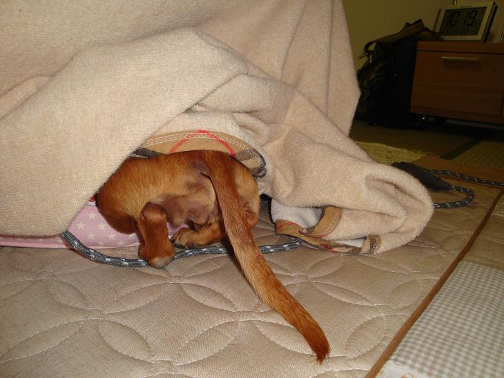 マーレーは、すかさずコタツの主になり、いい感じにくつろいでいる(*^_^*)くつろぎすぎている・・・。お前は、犬だよ☆