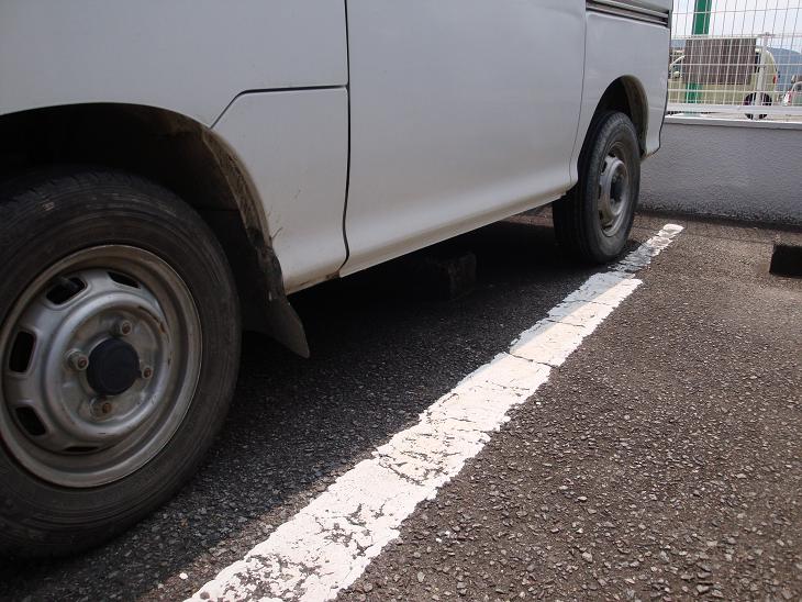 駐車場にある、車止め用の後ろに置いてるコンクリートの2個のブロックの位置。さっちゃんの車の下にあるじゃないかっ??
