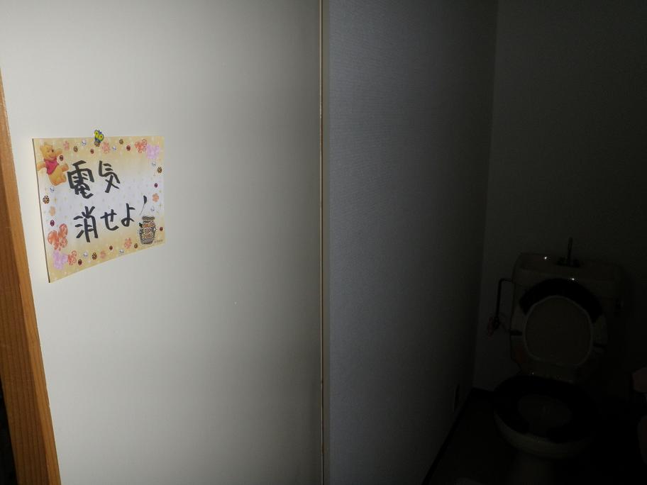 ご覧の通り、トイレの扉には「電気消せ!」って書いてるにもかかわらず言う事聞かないさっちゃん☆