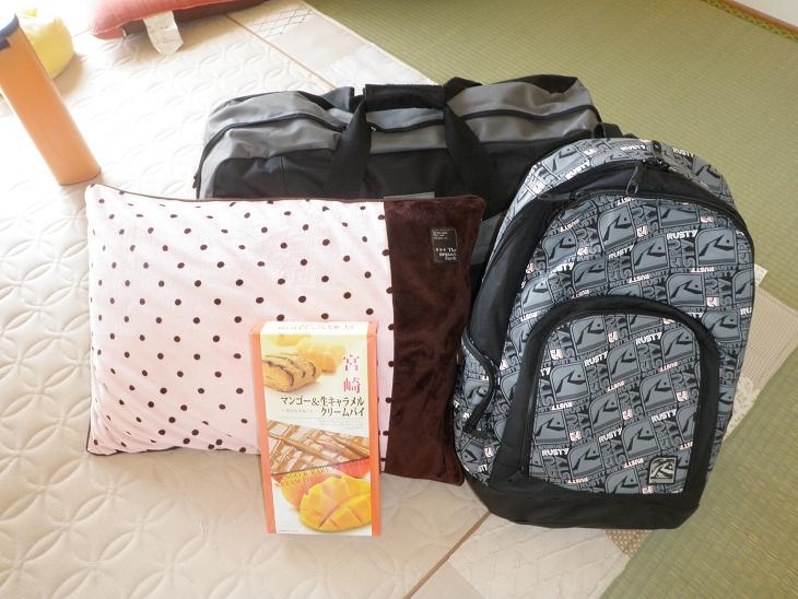 大きなカバンにRUSTY D-BAG☆と、茨城でお世話になるおうちへのお土産♪・・・と、my 枕(^_^)v