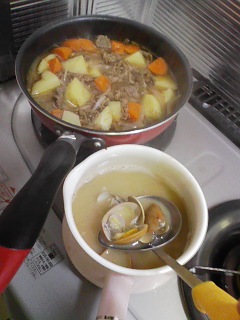 作らねばっ!っと 張り切って肉じゃがと 潮干狩りで採った貝のみそ汁(^▽^)Yそして さばをいただく事にしたが 肉じゃが待ち…(´Д`)