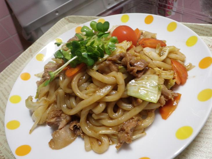 ほいっ!いろどりに、カイワレ&プチトマト乗せて~”焼うどん”の出来上がり~(*^^)v 10分くらいでできちゃったもんね~☆