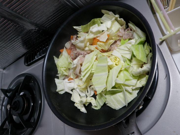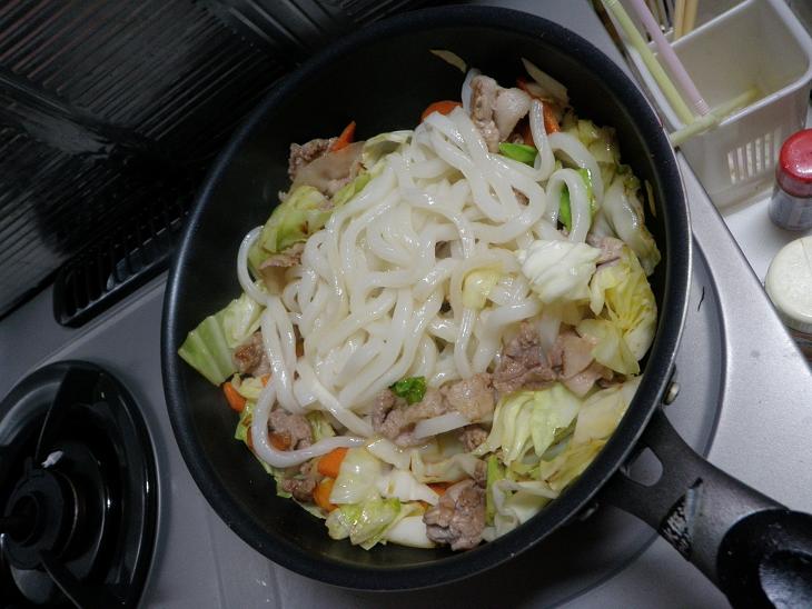 キャベツも炒めて、うどんも入れて~♪