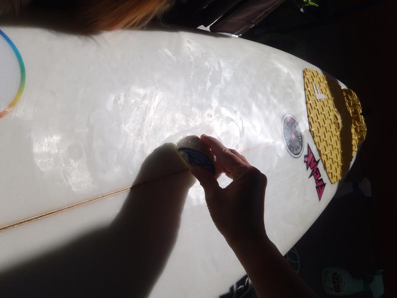 サーフィン前にもう一度、今度は水温に合ったWAX塗っていきまぁ~す(*^^)v今の時期やったら、SEX WAXのオレンジか赤かなぁ~☆(色で覚えてるから、WARMとかわからん・・・すいません・・・)